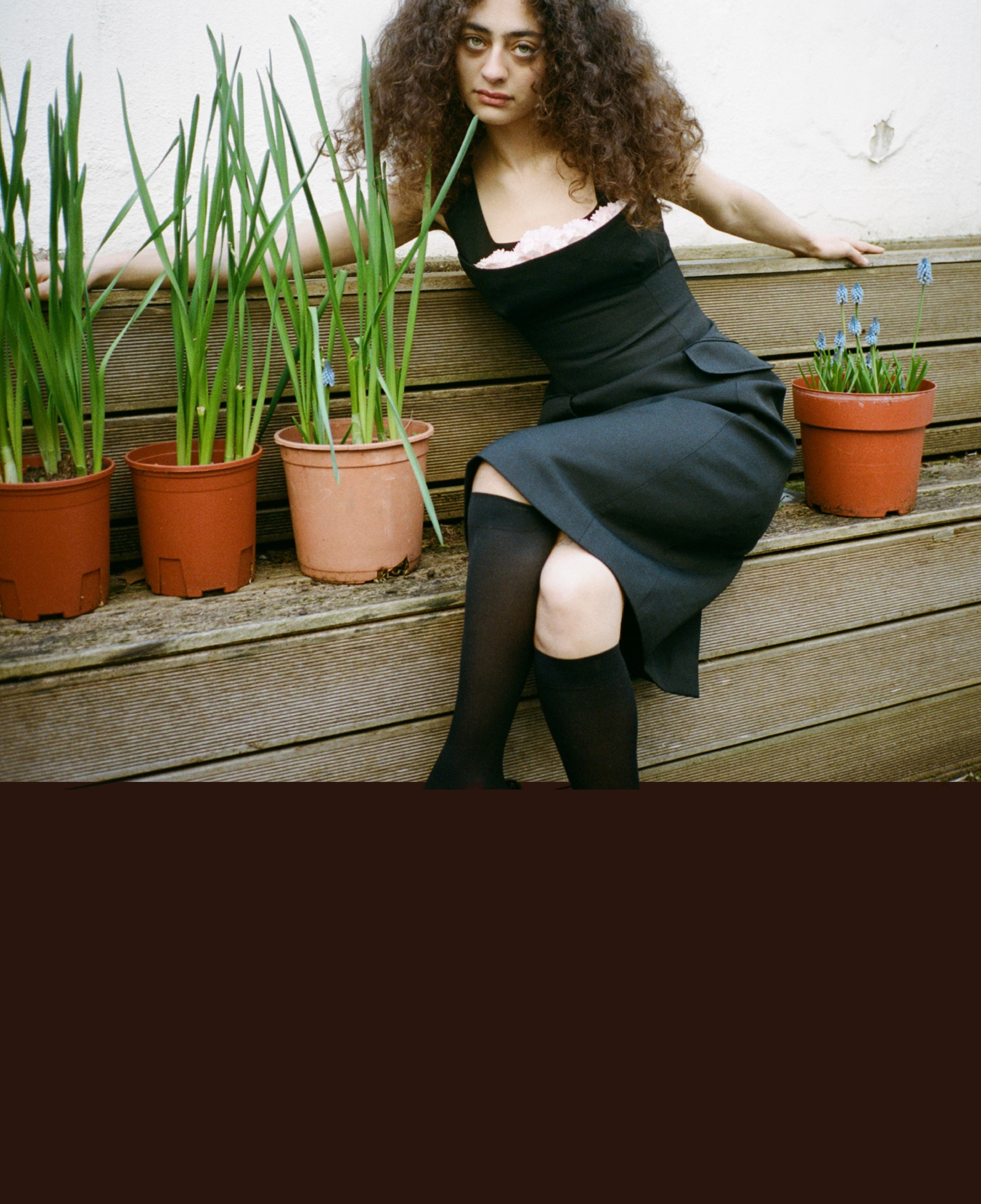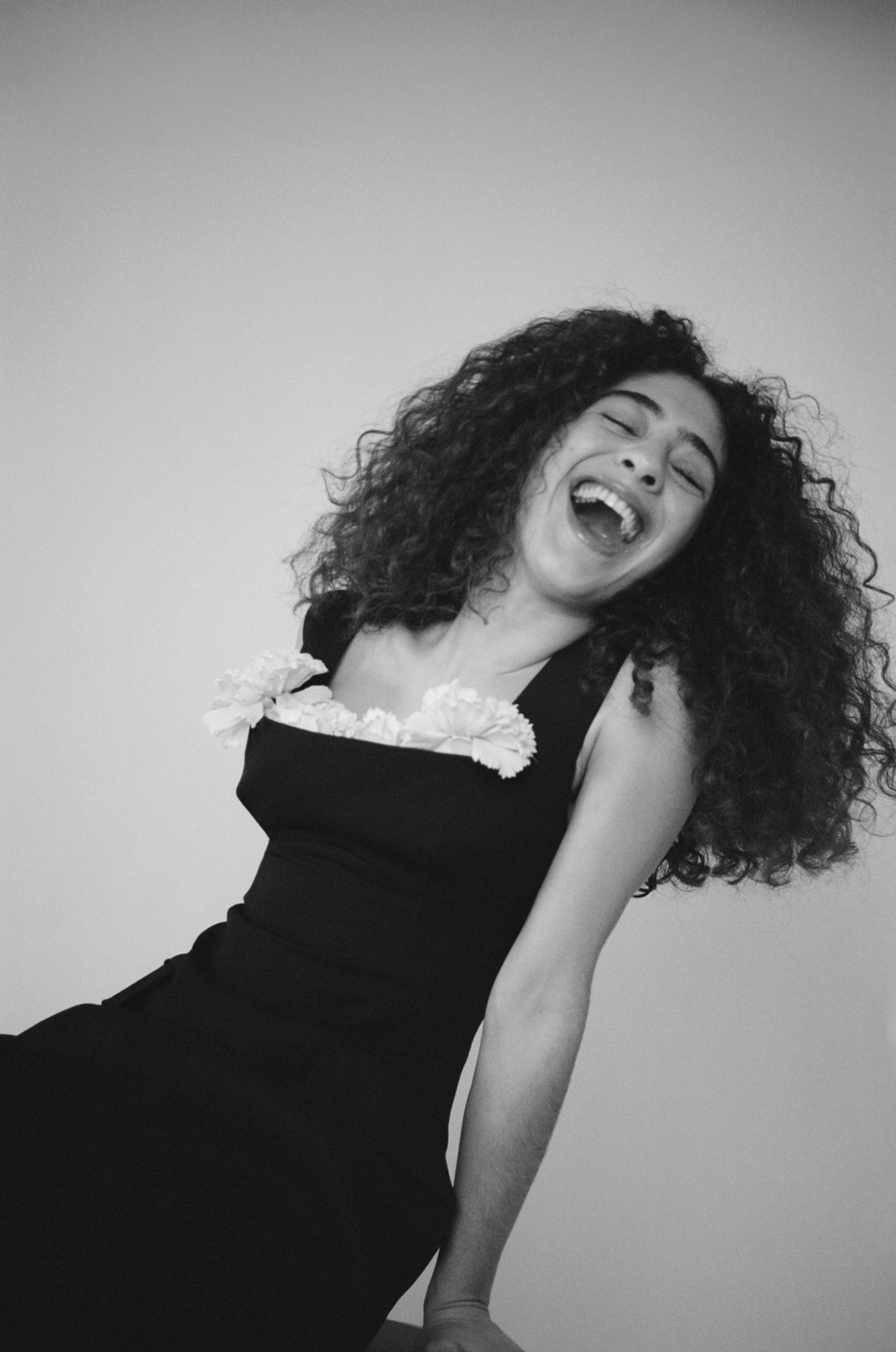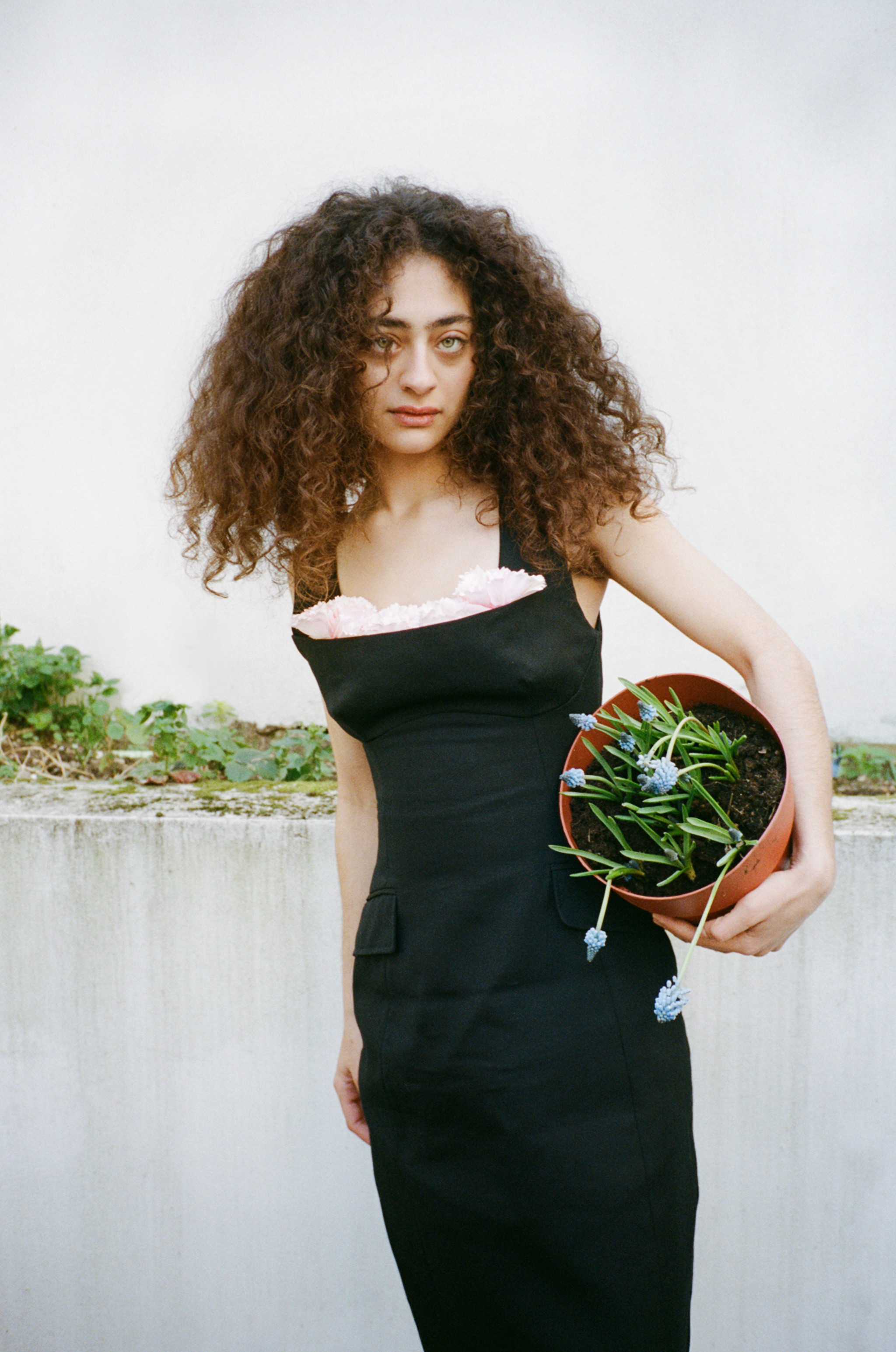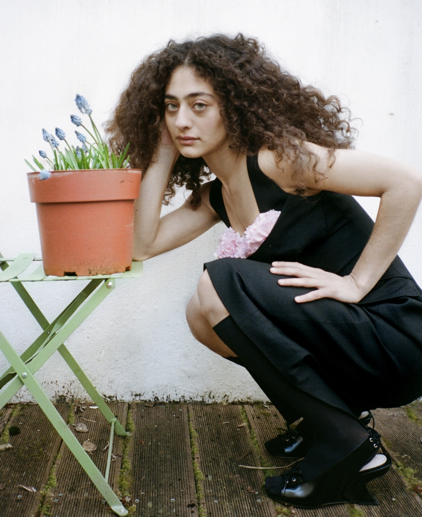 Deba Hekmat is wearing a stuffed carnation balconette bust dress and black curve wedge sandals by Simone Rocha.