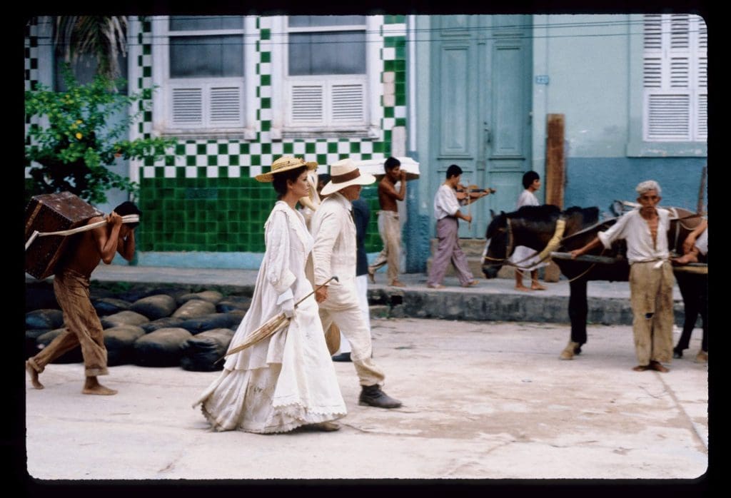 Fitzcarraldo, with his imperious manner, grubby white suit, mop of straw hair, china-blue eyes and mouth pursed in fanatical disdain is unforgettably played by Herzog’s favourite leading man, the authentically scary Klaus Kinski, with whom the director‘s love-hate relationship exploded in the punishing filming conditions on location: the unbearable heat, the insects, the snakes, the bad food, the danger and the endless delays.