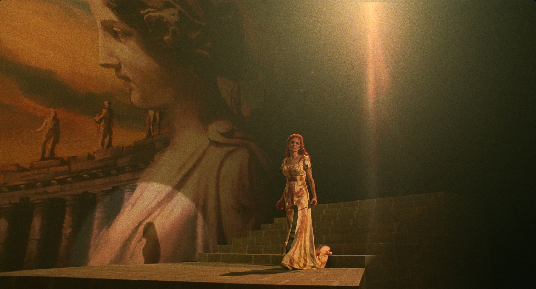 During the showreel of Callas’ most iconic roles that opens the film, it is clear Jolie carefully studied Callas’ gestures, leaning into the dramatic technique that heralded Callas as the greatest singing actress of all time. With seven months of vocal training, as opposed to a lifetime of devotion, Jolie—supported by the electricity of a live orchestra and audience—does a suitable job of embodying the knife-edge of making art with your entire body. Jolie’s savage, commanding beauty is captured perfectly in the intimate close-ups of her lip syncing Desdemona’s ‘Ave Maria’.
