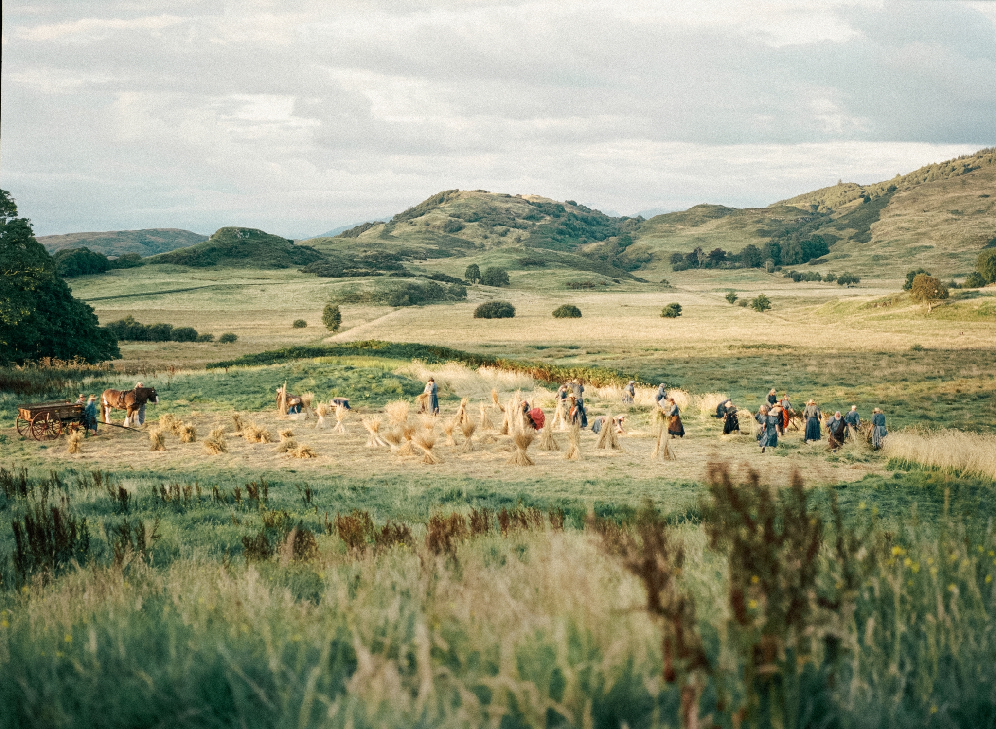Despite loving those weeks on his own leading up to principal photography, Jones emphasises that what he cherishes the most about the making of Harvest is the sense of community established on set, one he hadn’t “quite experienced” before. Tsangari heavily involved Oban locals, having them in front and behind the camera as extras and runners, with everyone living closely together during production. Before shooting began, producers organised a small ceilidh in the community hub, where Jones joined fellow cast members Harry Melling, Rosy McEwen, and Arinzé Kene in twirling around with townsfolk.
