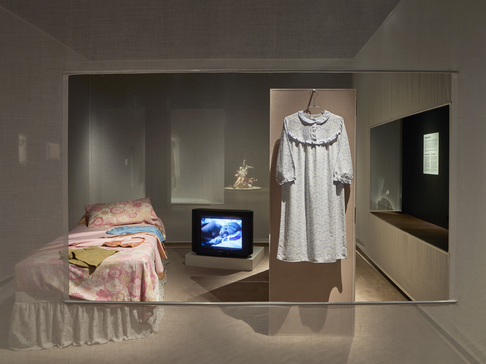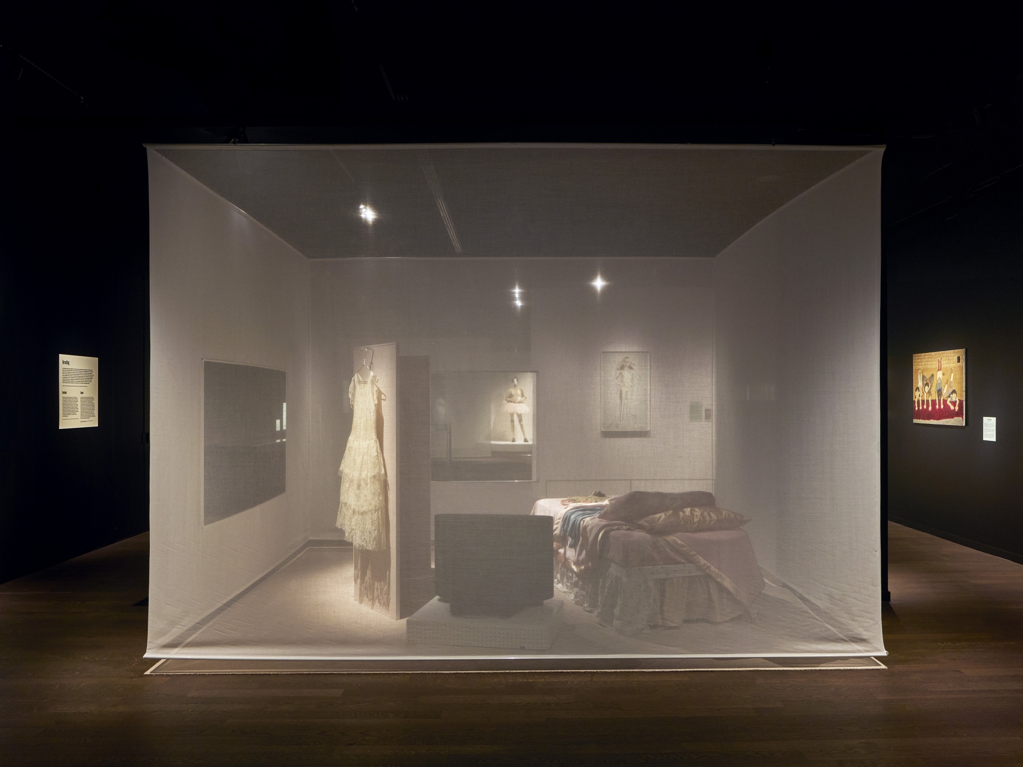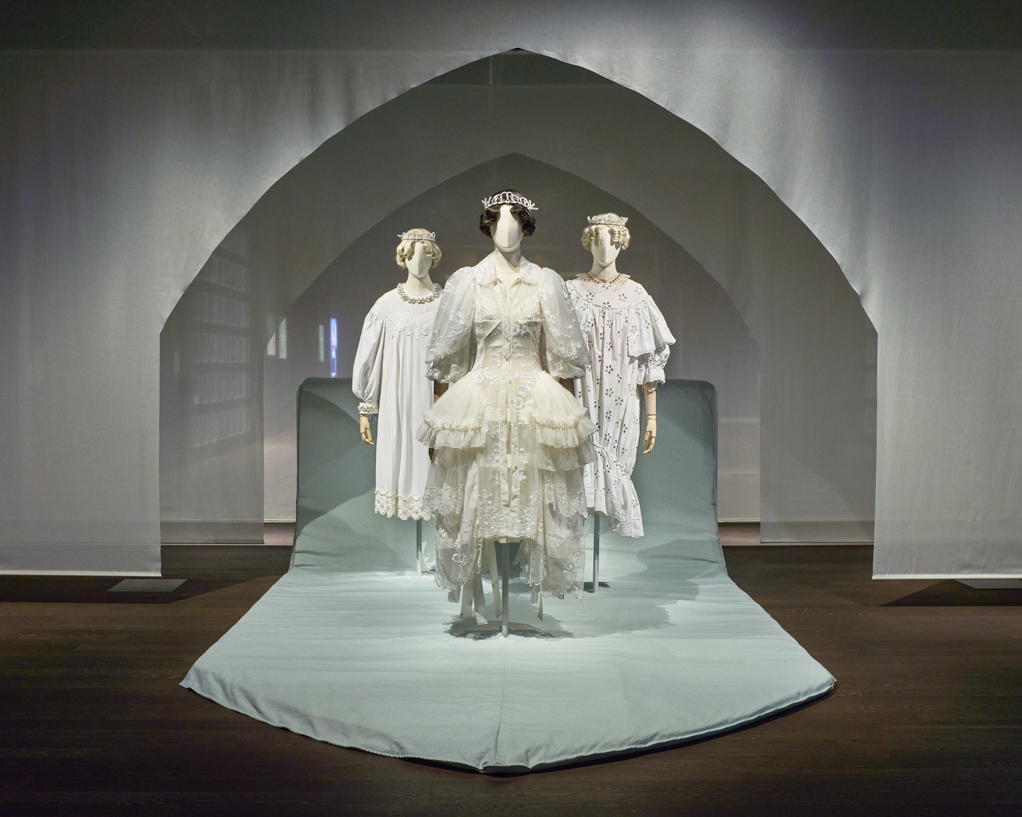 One of three ‘bedroom’ installations that establish the exhibition’s tone and interpretation of girlhood as a way of seeing, (additionally addressing its three core questions, about how girlhood has been represented, is remembered, and the idea of how ‘the girl’ shapes visual culture and fashion), partially concealed by translucent cream fabric is Lux’s floral prom dress. A near carbon copy of those worn by her sisters, (they’re described on the page as a “four-headed-creature”), the dresses were made by their mother, and in the film Coppola briefly puts us in the fabric shop. Hanging beside it at MoMu is Cecilia’s lace dress, the backstory of which is usually less explicit; Steiner says she imagined the youngest Lisbon rescuing their grandmother’s wedding gown from a box in the attic. Close-by, on a single bed dressed in era-appropriate pattern lies Lux’s bikini top, described on screen as, “a swimsuit that caused the knife sharpener to give her a 15-minute demonstration for free.”