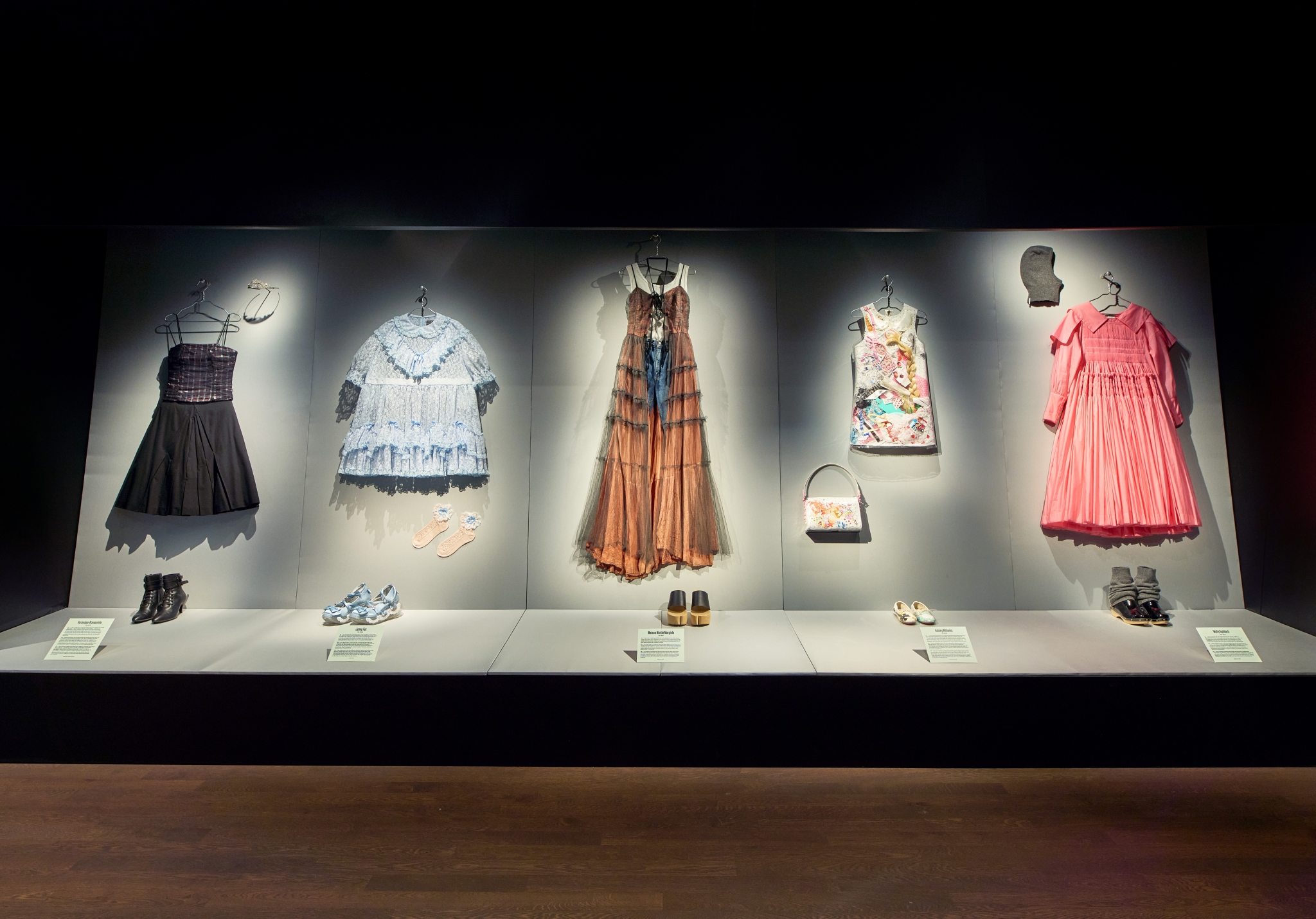 A display of white frocks by Simone Rocha for example, appears in dialogue with a vitrine of accessories intended for one’s First Communion. Growing up in Ireland, the designer was enamoured by the outfits friends wore for theirs; unable to partake as a non-Catholic, her dresses would become a kind of response. Harley Weir meanwhile, with i love you as a friend, cuts and collages the familiar pastel pink notes of her youth. “Working on [previous MoMu show] Echo made me realise that so much is in memories,” continues De Wyngaert, “and many of those memories are based in teenage years, especially for girls. They speak about it and write about, and use it in their later work.”