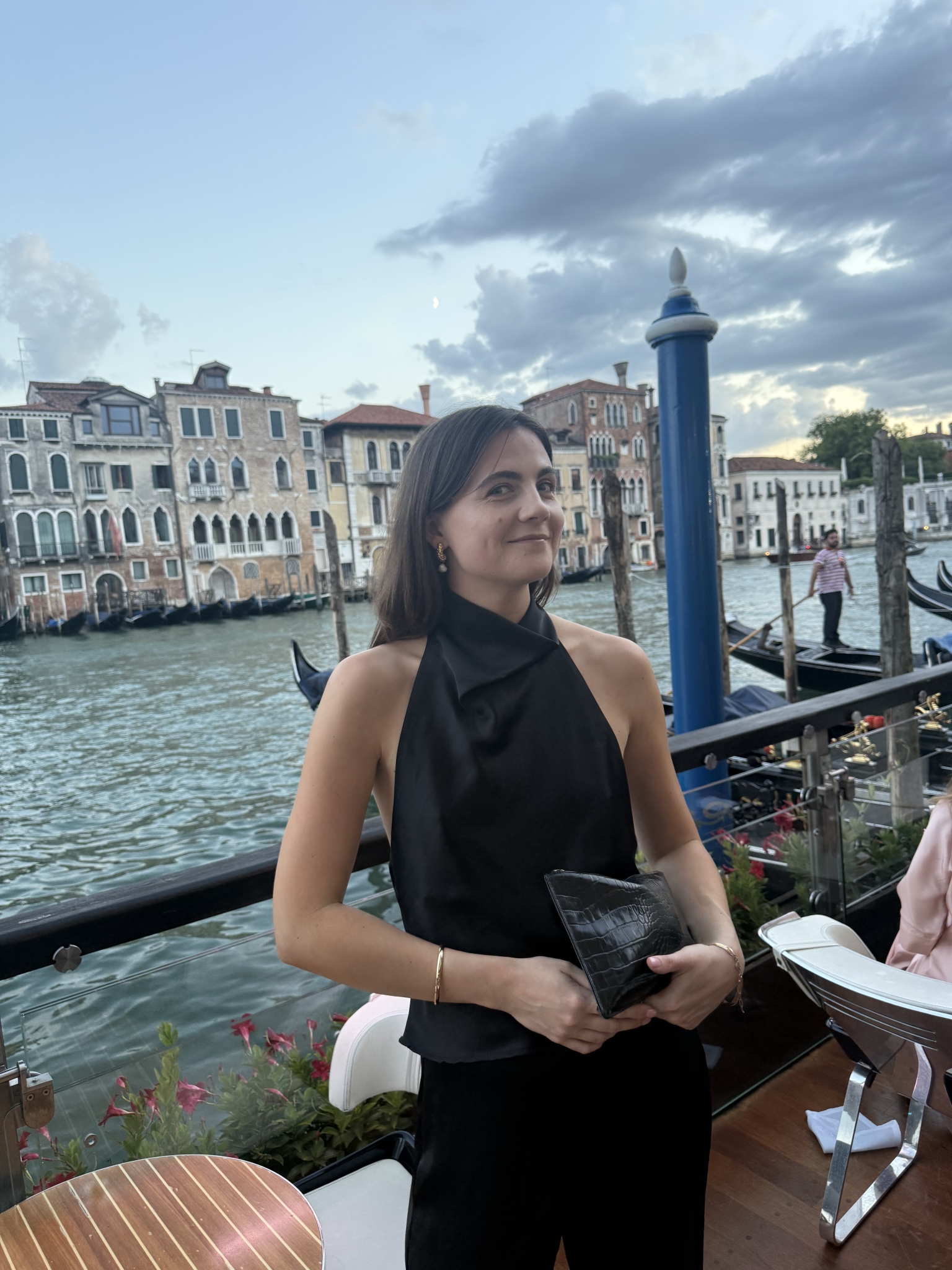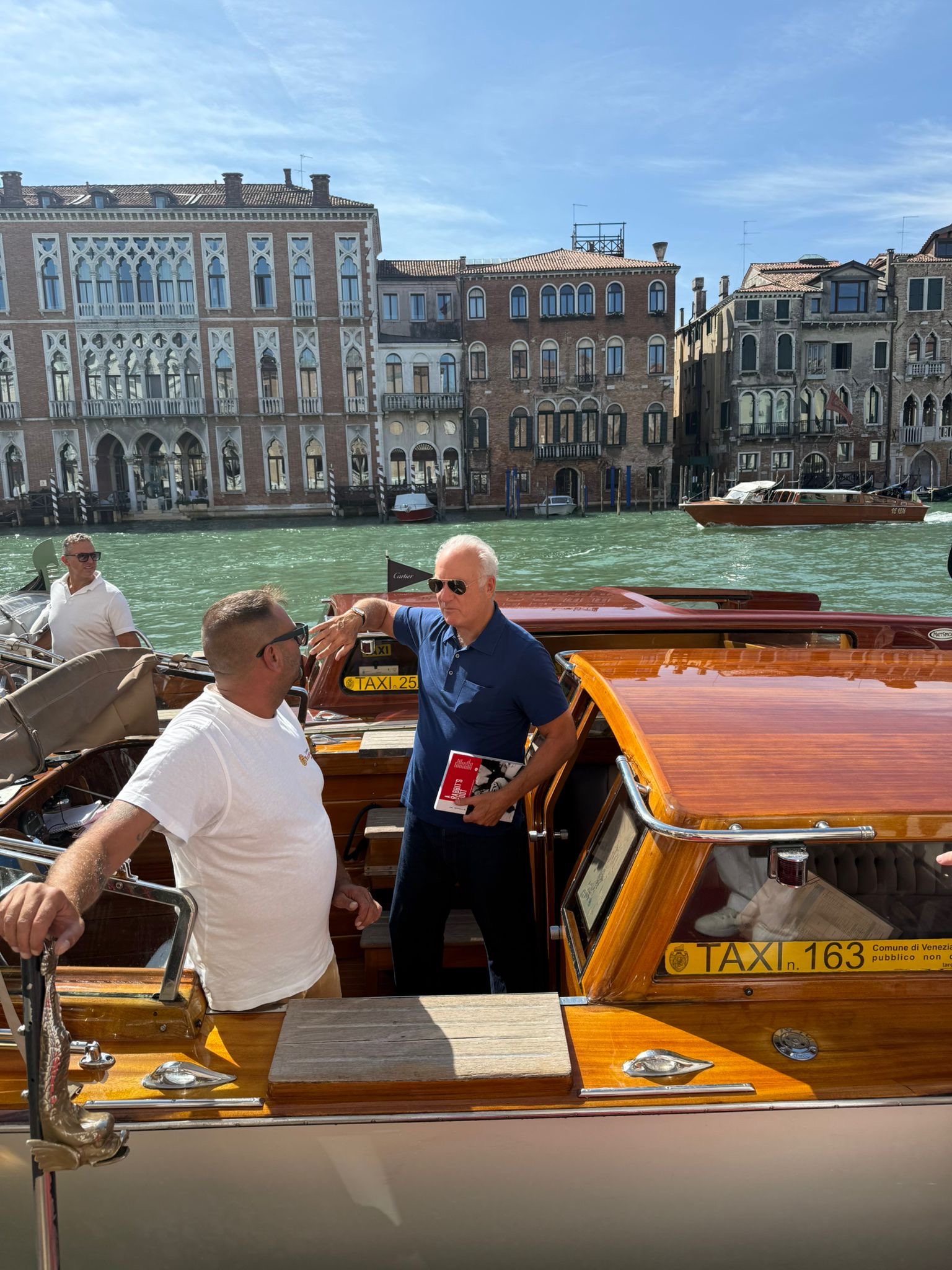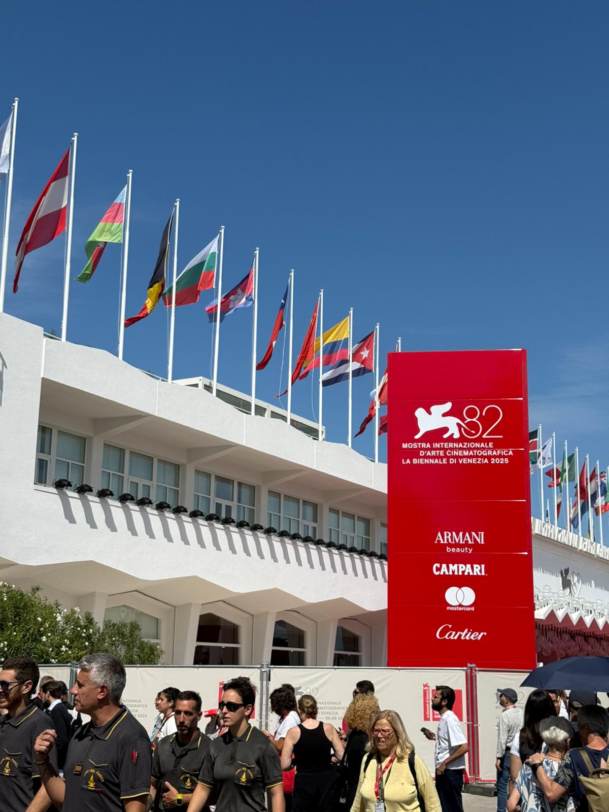 What attending a few film film festivals now has taught me is that the plane and airport themselves can be opportunities for the most fruitful networking—and celeb spotting. On our flight, my colleague Luke and I bump into our Editor-in-Chief, Charles Finch, also in town for the festival. (He jokes that he’d expected us to be on the 6am flight). A friend WhatsApps us to say that she has spied actress Mia Goth—in town for the premiere of Guillermo Del Toro’s Frankenstein—on her flight. At our airport arrivals, we realize George McKay, in town for Rose Nevada, had been on ours. I spy him chatting with some producers at the baggage reclaim and the paparazzi swarm him when we arrive at the airport’s boat terminal.