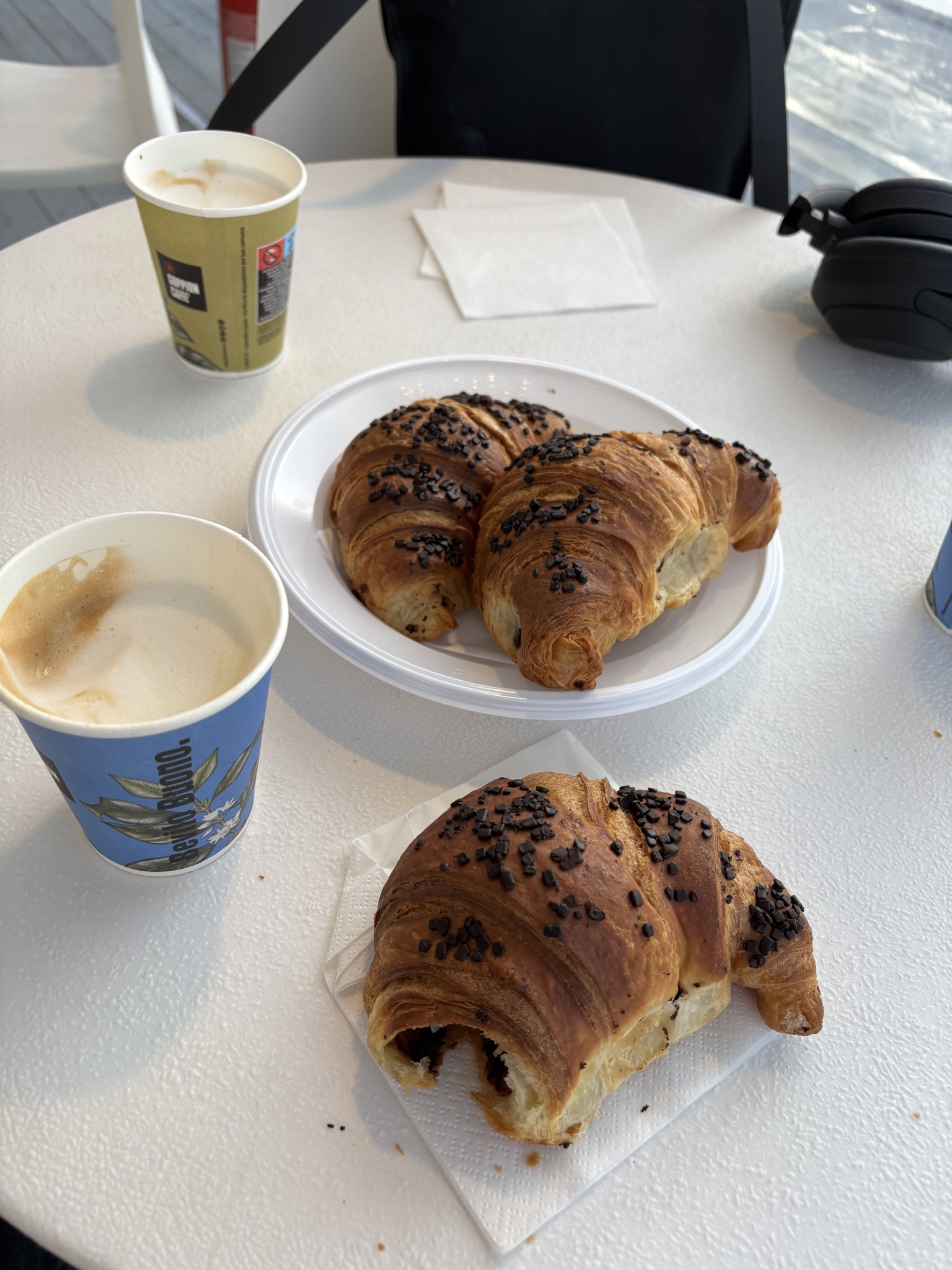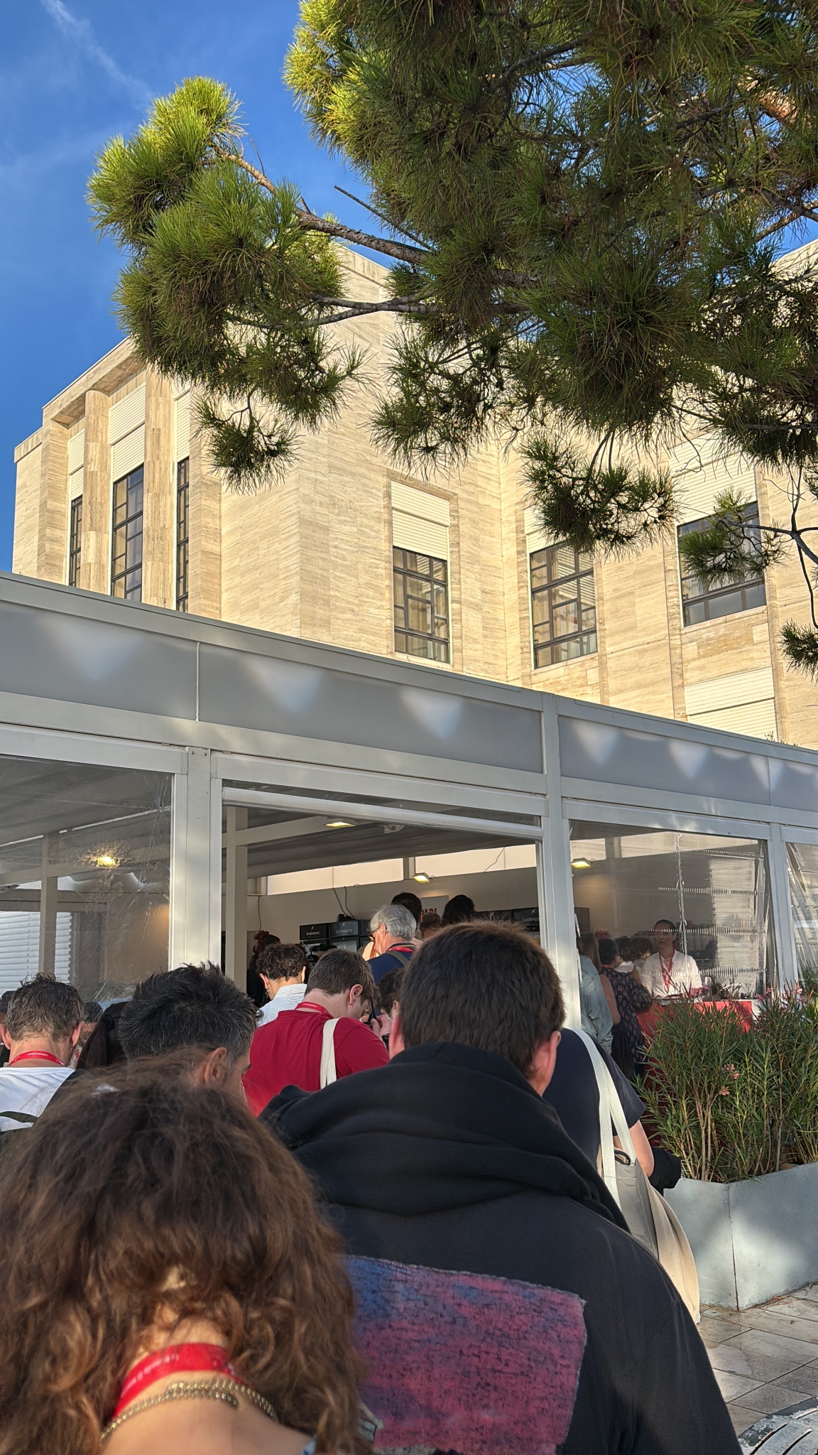 The sky is clearer. I make my way to the Lido from San Zaccharia. What I learn quickly with Venice, is that when you aren’t sure where to go, just follow other people in lanyards. I stand in a long line for the morning shuttle over to the Lido. There are two routes—one that involves a follow up bus and one that gets you straight to Lido Casinò—the festival area which is built round palatial, white modernist buildings. I join the queue for coffee and cornetti, which takes 15 minutes but is worth the wait.
