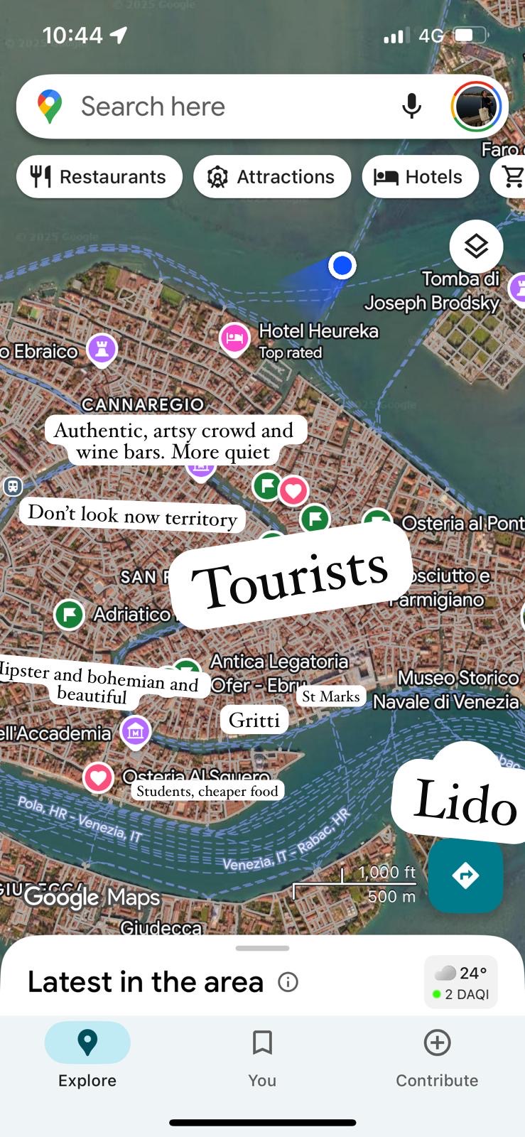 In the leadup to the festival, I had been a little apprehensive about how the hell you even get around a city made of water with anything that resembles efficiency. Luckily, Chris Cotonou, our Deputy Editor—also a travel expert—is quick with assistance, explaining we need the Allilunga—a water bus which will take us to the island, and creating a map of places to avoid (‘Tourists’), and places to check out, including the Lido, a strip of land off the main island where the festival all takes place.