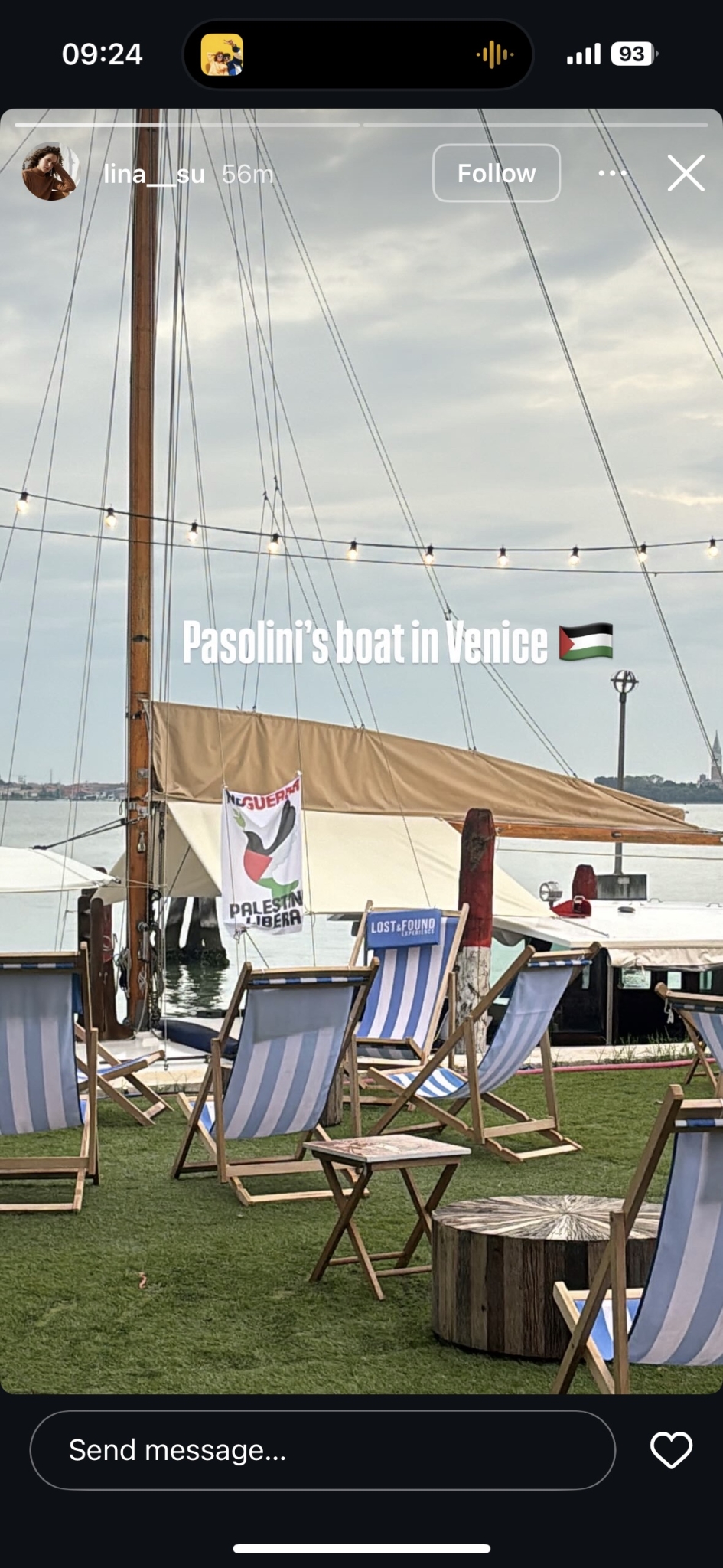 Yet politics is an even bigger part of the festival this year, in particular the responses to the genocide in Gaza. Before arriving here I’d seen a photo on Palestinian-Algerian filmmaker Lina Soualem’s Instagram story of Pasolini’s boat, which has been covered in Palestinian flags. She urges us to see ‘Who is Still Alive’, a film by Nicolas Wadimoff, about the lives of Palestinians who have escaped Gaza, later in the week.
