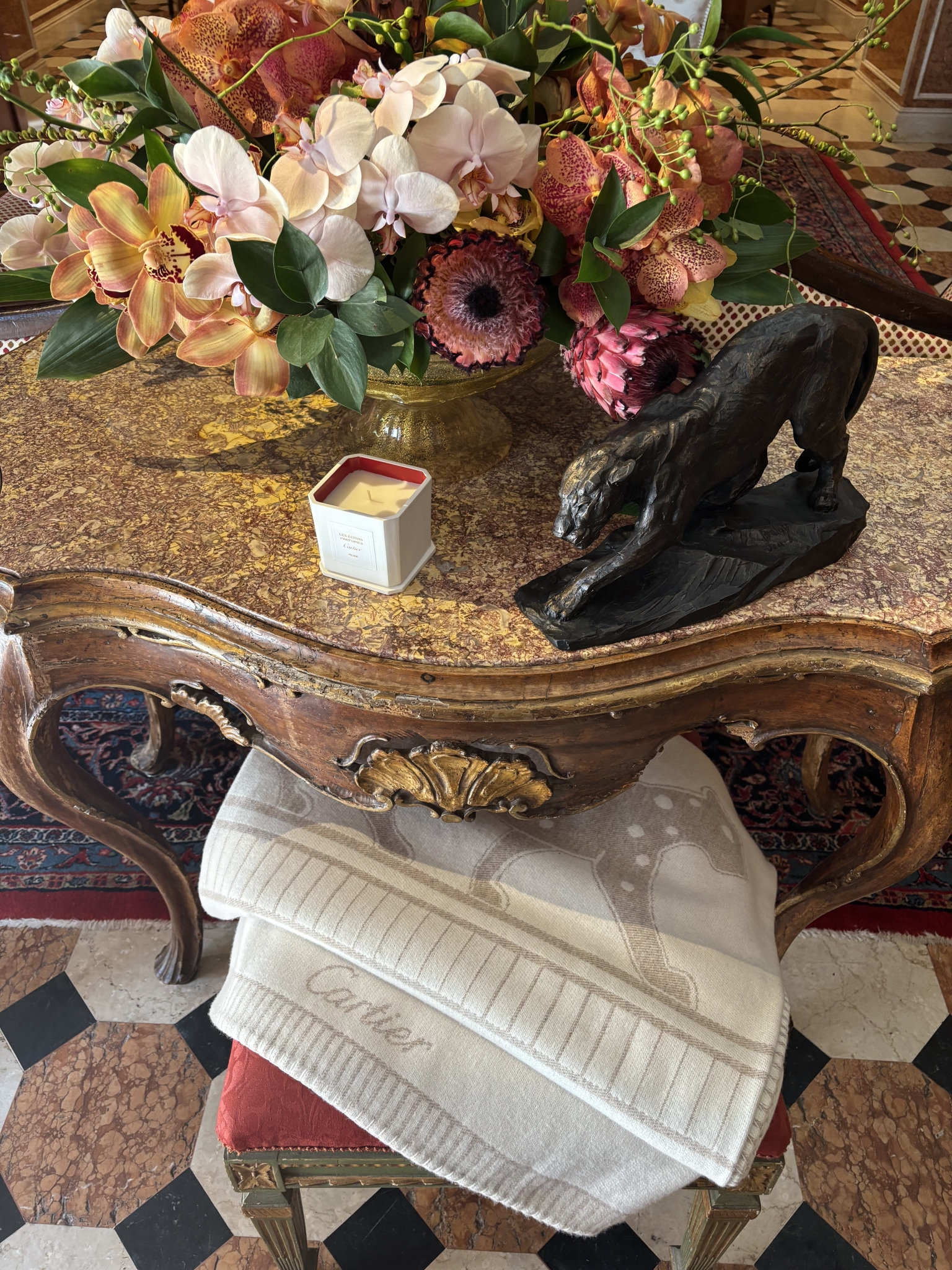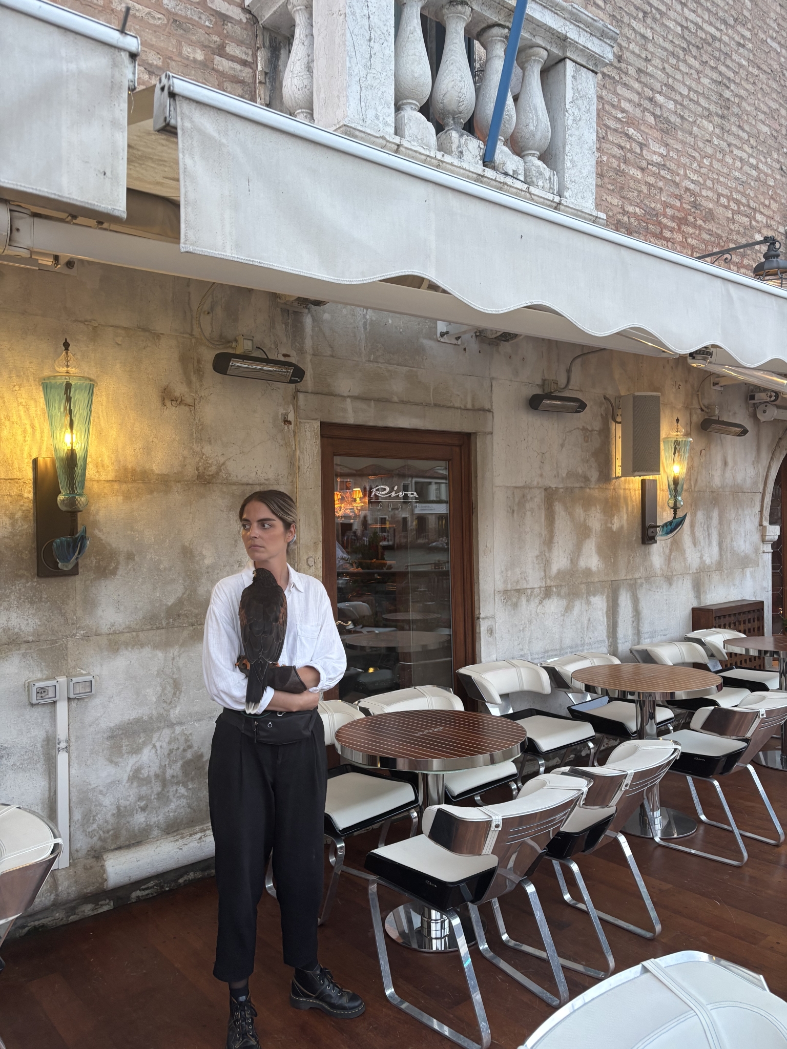 The main event of the day, however, is our A Rabbit’s Foot dinner with Cartier—one of the festival’s key sponsors—and hosted by our Editor-in-Chief Charles Finch at the Gritti Palace, which is one of Venice’s most iconic hotels. First I make a trip over to the Cipriani in Venice, for a quick meeting. It is filled with influencers and film people. Another downpour of rain starts. The person I am with explains that in late summer and early September, Venice is prone to ‘rain bombs’—when the atmosphere gets more and more charged and it cracks into heavy rain. I have a hot chocolate on the terrace by the pool as it subsides. As I wait for the Cipriani shuttle boat, Chloë Sevigny walks past me, on her way to a premiere in a sculptural dress made of lace.