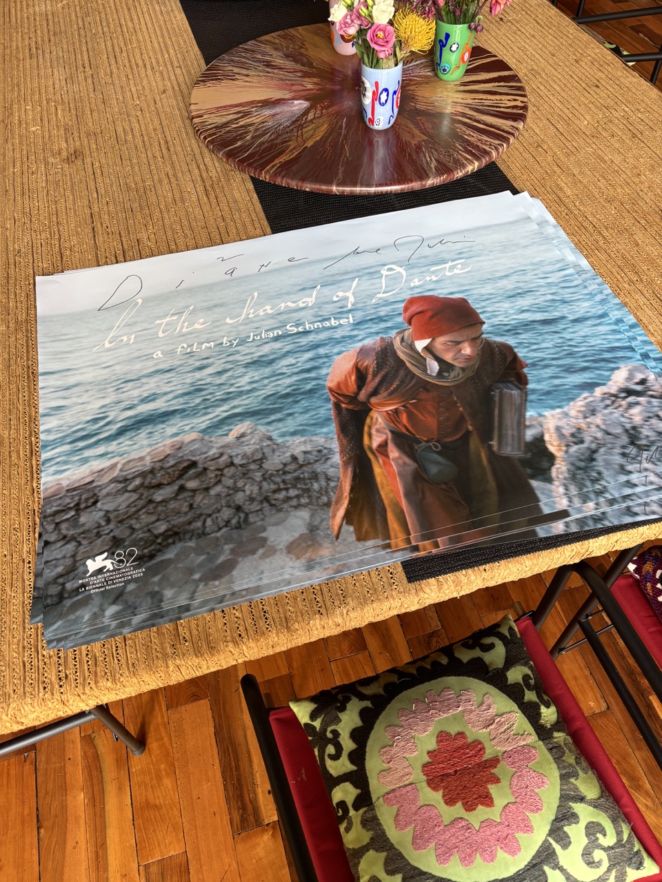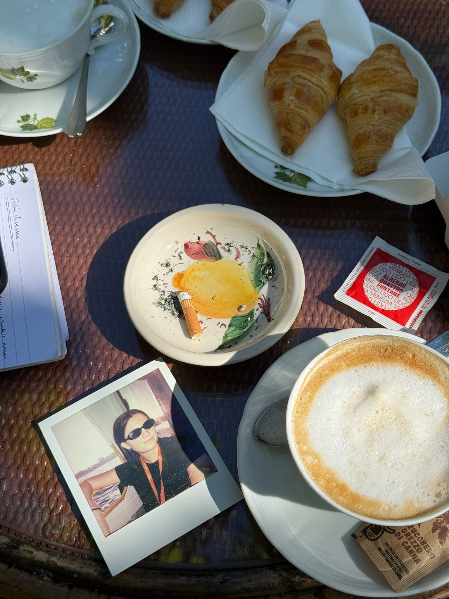 On Tuesday, I meet Fatima at Harry’s Bar (it’s my first time through the saloon-style doors). We are invited to a reception to celebrate Julian Schnabel’s film In The Hand of Dante. The film has an intriguing premise. What if a mob boss found a handwritten manuscript of Dante Alighieri’s Divine Comedy? Schnabel—a larger-than-life character—started his career in painting before making his first film about Basquiat. He later won the award for best film director at Cannes in 2007 for his adaptation of The Diving Bell and the Butterfly. The reception takes place in an area of Venice I am yet to go to, a few minutes up the river towards the Università Ca’ Foscari in Dorsoduro. The event, co-hosted by fashion designer Diane Von Frustenberg, also happens to take place at her Venice home which occupies one floor of a palazzo. It is, to put it simply, one of the most beautiful places I have ever been to, every surface of it a testament to her taste, with clashing patterns and a mouth-watering collection of art. (I spot a diptych by Warhol and a table made by the sculptor Saint Clair Cemin). I bump into Vicky Krieps, who is in town for the première of Father Mother Sister Brother, the latest offering from indie American auteur Jim Jarmusch (and goes on to take home the Golden Lion. It’s a triptych about the guilt and awkwardness and uncanny closeness that comes with being family, and Krieps who is wonderful as the rock n’ roll sister of a bookish Cate Blanchett and the daughter of a Rampling-esque Charlotte Rampling. She dyed her hair bubblegum pink for the roll, and in Venice she has reprised the colour for the red carpet. Also at the event is her co-star Lukka Sabbat, Julian’s son Vito Schabel, Francis Ford Coppola and DVF herself, of course. We leave, walking through quieter streets of Venice, filled with shops selling masks and murano glass. In the evening I have a Hugo spritz and a plate of ciccheti with film PR Charlotte followed by a bad pizza off St Mark’s Square. She tells me she has been looking after Willem Dafoe, who is starring in Gaston Solnicki’s The Souffleur, while he is in town. Dafoe lives in Rome and is beloved by the Italian public. She recounts an anecdote. A carabinieri asked for a selfie. “Well I can’t say no,” replied Willem Dafoe. “You are literally holding a machine gun.”