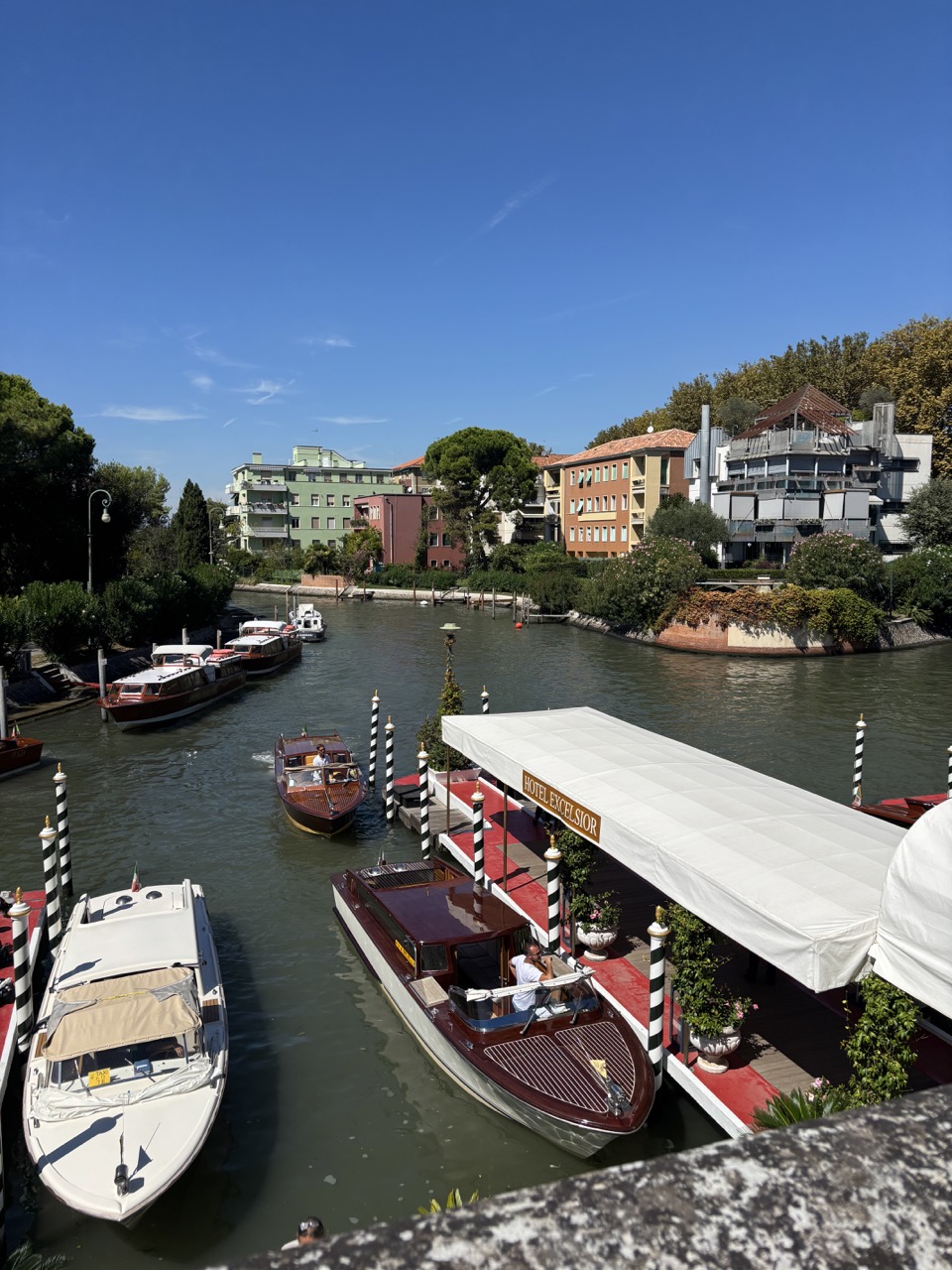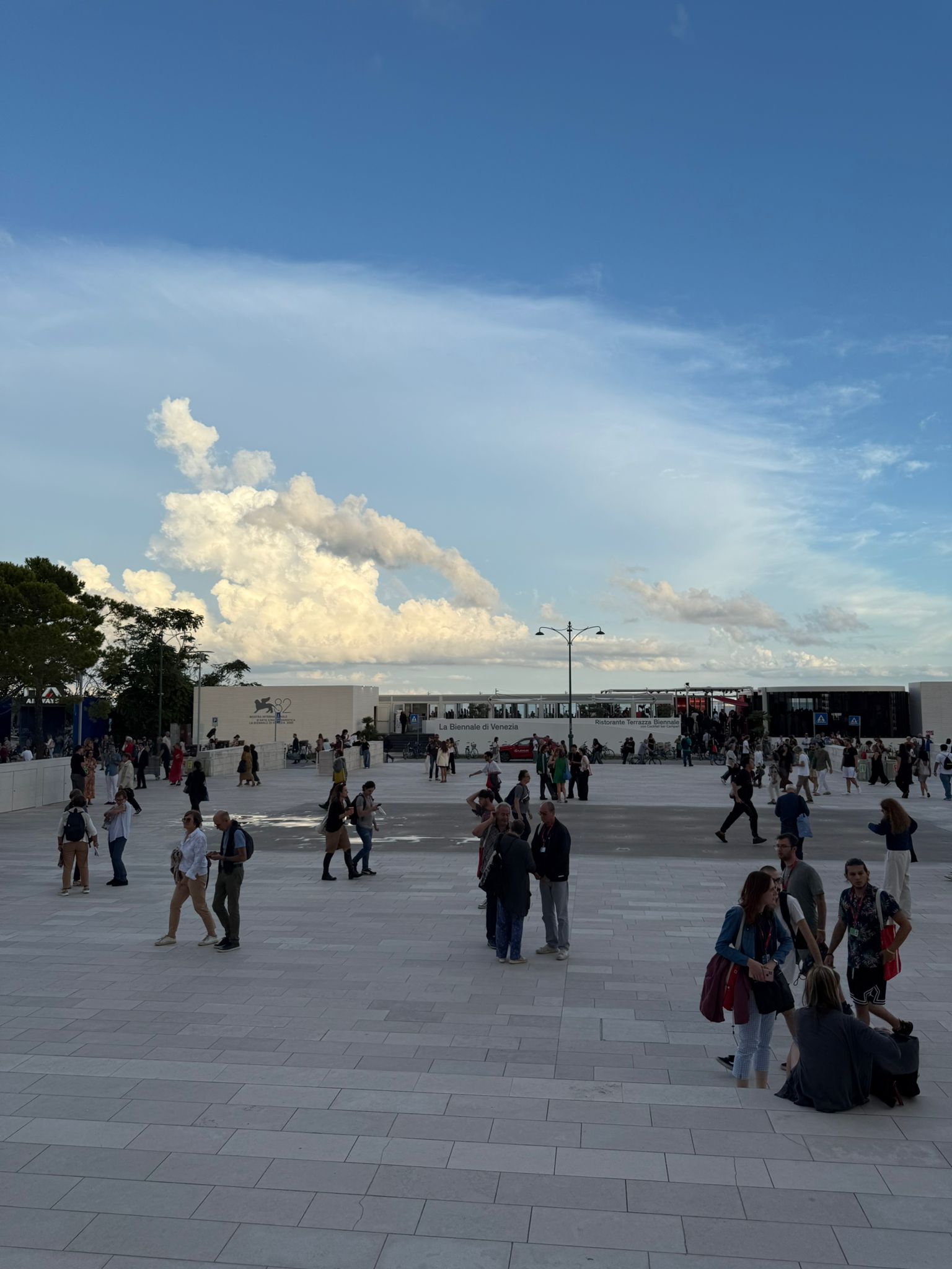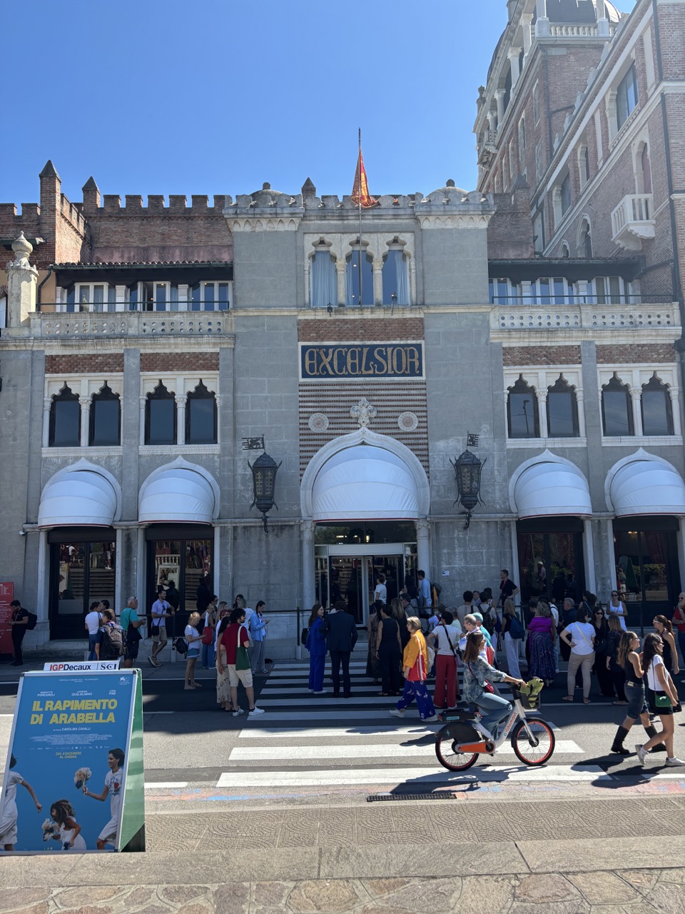 Sunday and Monday pass by in a blur. On Sunday afternoon, I head to the Lido. A 10 minute boat shuttle away from the city, the Lido is a long peninsula of land, 1km wide and 14km long, and far more modern than Venice proper. The festival itself was founded by Mussolini in the 1930s, and all the key buildings are in the white, neoclassical style typical of his regime. The ‘Golden Lion’, the festival’s key prize, used to be called the Coppa Mussolini. I meet Chris and Luke from my team at the Albergo Quattro Fontane, a sort of chalet-style restaurant and hotel near the shuttle drop-off which is filled with industry people and often hosts parties and junkets. There, we bump into Lina Soualem, who is on the jury of this year’s Critic’s Week—her own film Bye Bye Tiberias, explores the story of her mother, the actress Hiam Abbas (you might recognize her as Logan’s third wife in Succession) who is Palestinian. Soualem herself wears a Keffiyeh over her shoulders. She has rented a bike with which she can nip up and down the Lido with (I noticed it’s a hack shared by many more seasoned Venice festival goers).