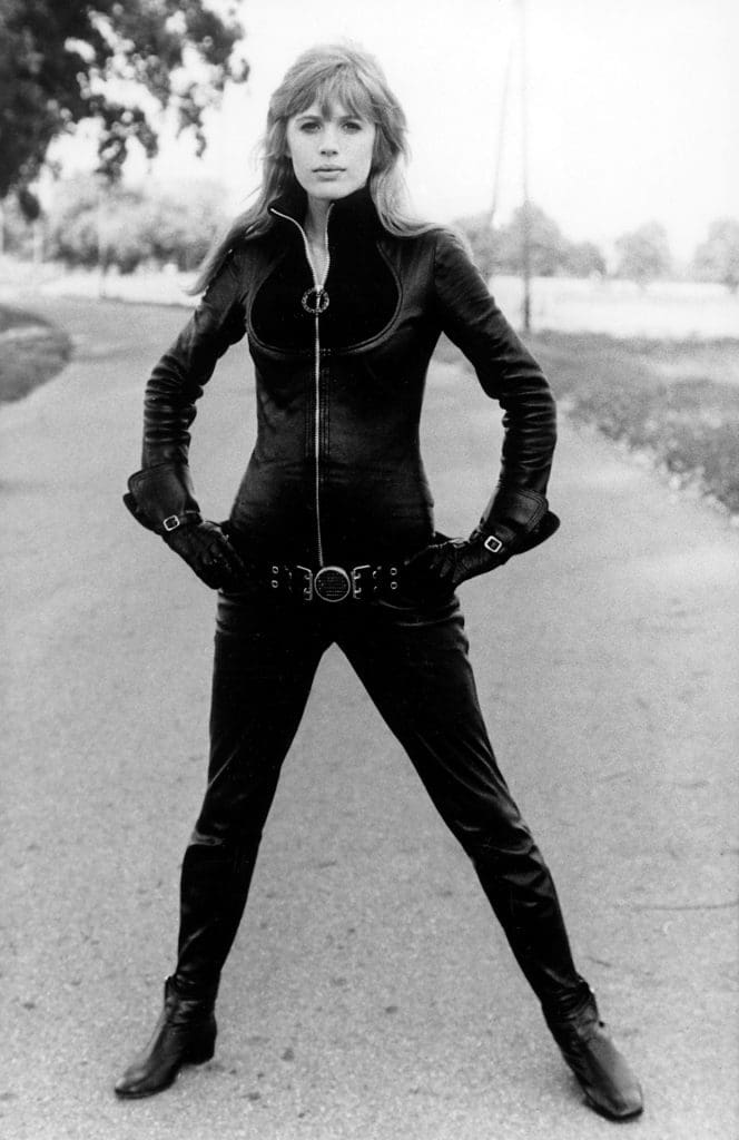 Nevertheless, the motorcycle culture continued to objectify women (Mandiargues’ book certainly didn’t help). Take one look from any poster or media from the 1960s or 1970s and you’ll find a female rider, draped provocatively across a bike (all too often safely parked). It’s showing, not doing. In tandem, with more females mirroring Goldmann’s new look, the bodysuit with its slinky feline form shifted to being called a catsuit; a trend influenced by Catwoman’s popularisation of the look as a leather-bound femme fatale.