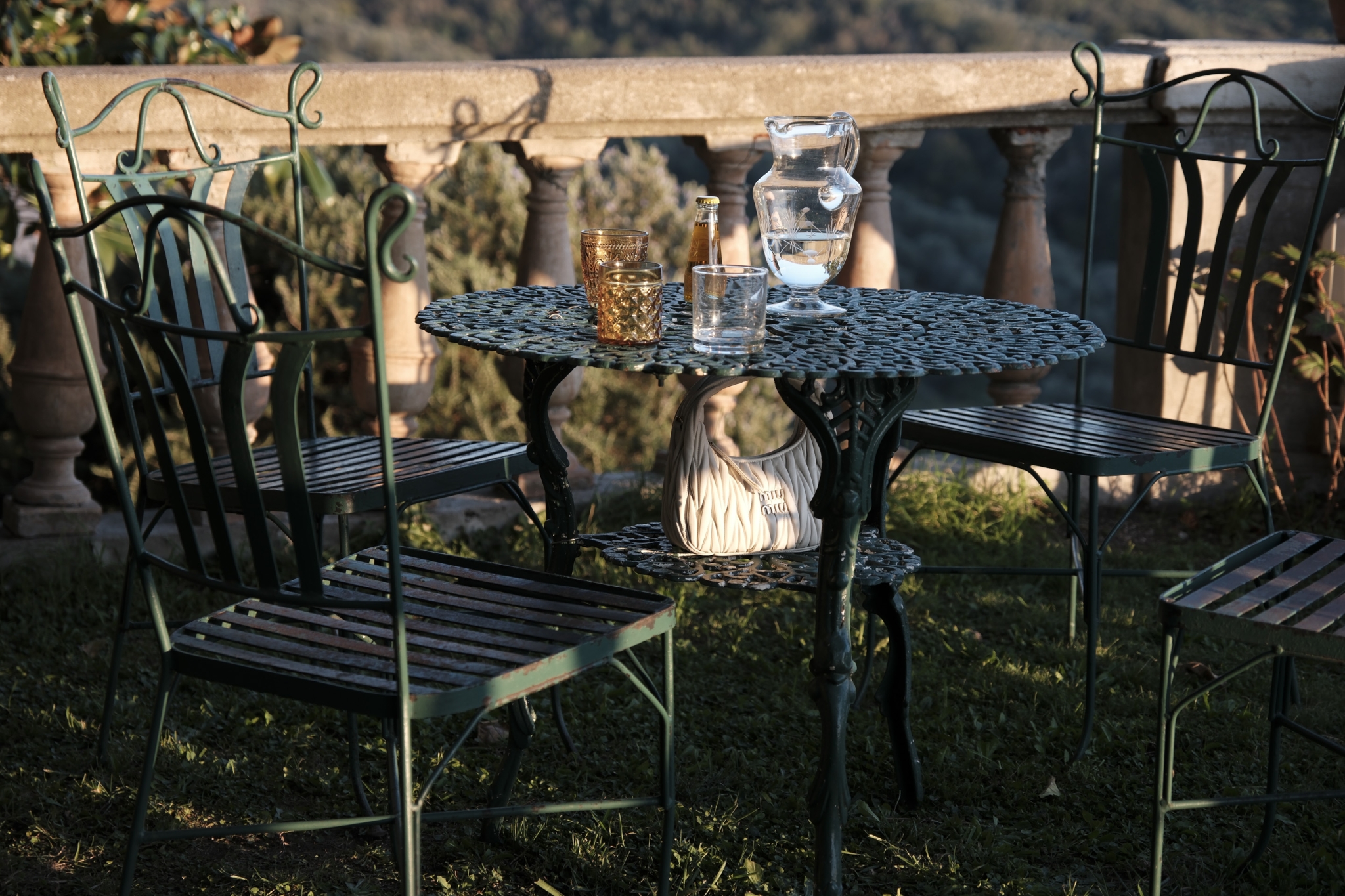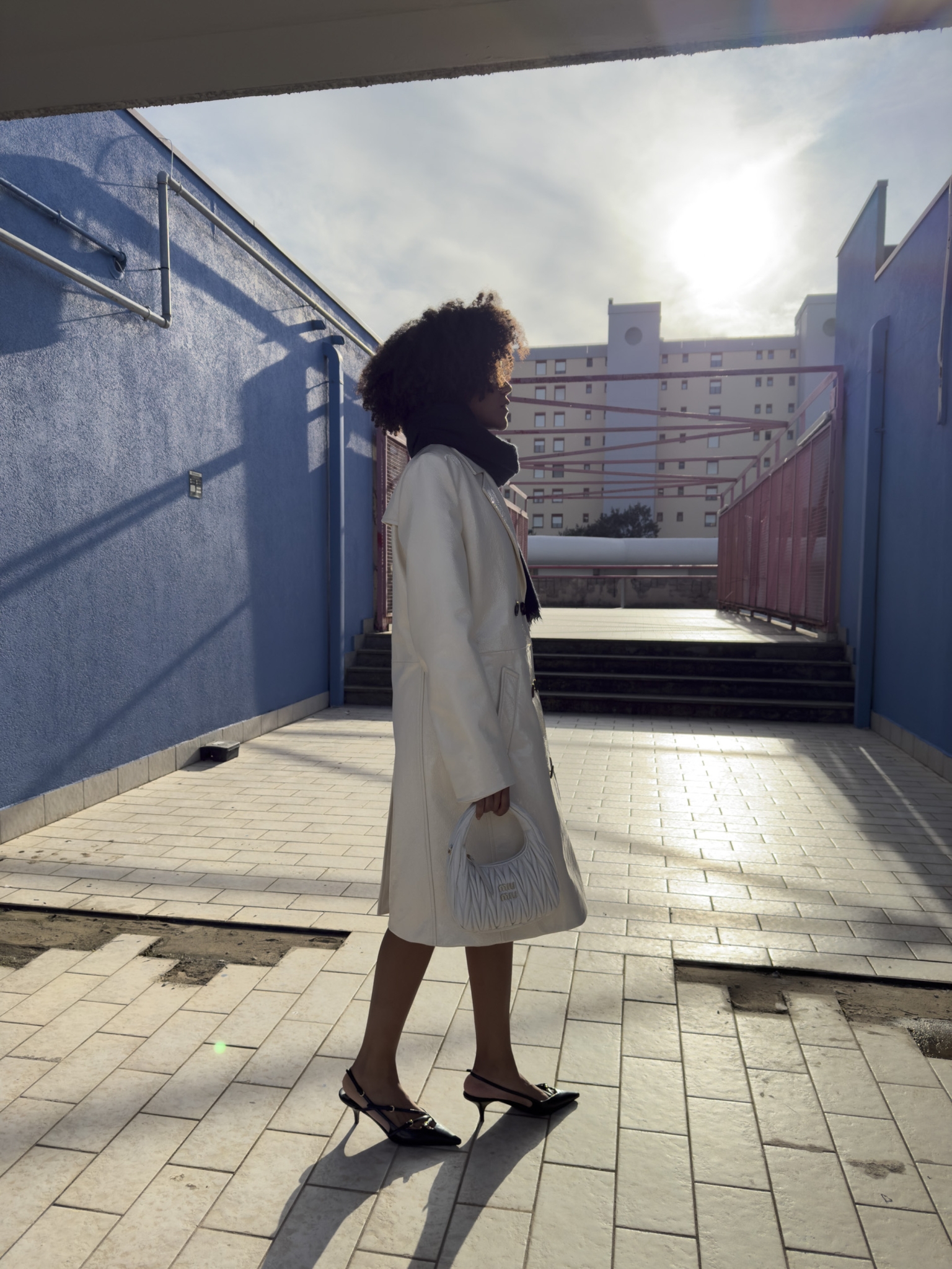 The only stipulation for the series is that Miu Miu clothes are used. “It’s really free… one pair of Miu Miu shoes would have been enough,” notes Hogg. Yet, without registering the model’s significance to the brand, she was drawn to the white Wander bag to be her protagonist. “It’s got character, it already looks like it’s had a bit of a life with that matelassé leather, and the shape of it, I thought early on I wanted to shoot through the handle. It looked like a bit of an eye or something,” says Hogg. “I also liked the idea of wandering—wandering through your life, a sense of wonder” adds the filmmaker, who describes preparatory trips with the white bag. “I took it around with me. If I saw a particularly nice sunset, I’d go and plonk it on a rock and film through it.”