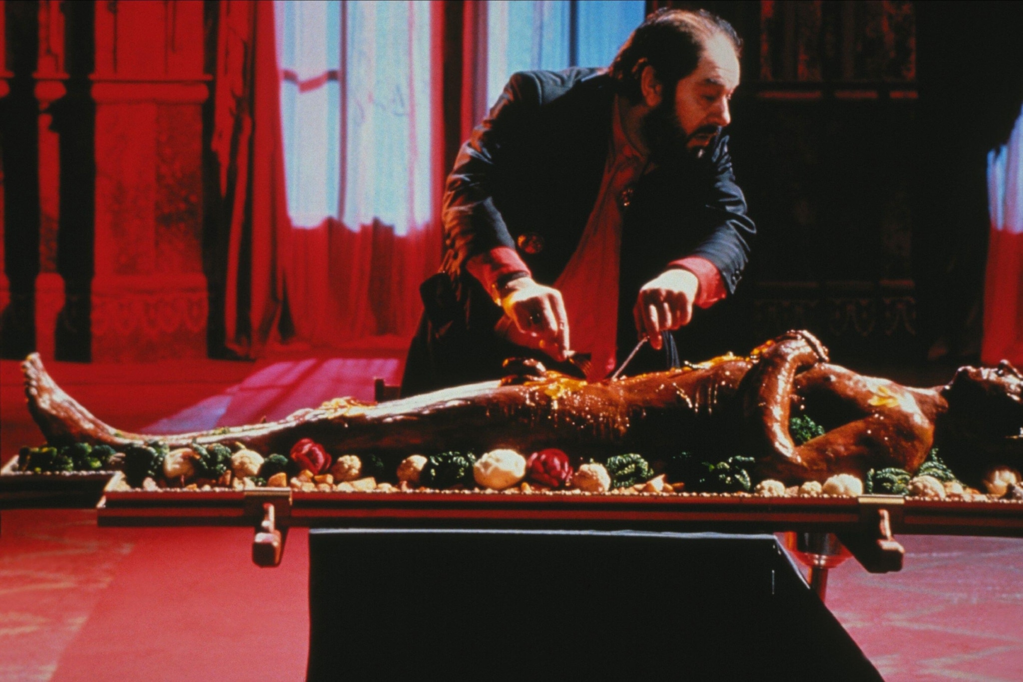 Originally trained as a fine artist, Greenaway told the author Brian McFarlane in 1990 that: “There is a mediaeval-like feeling in The Cook, the Thief about this rotten, worm-infested body which is covered in an extraordinary gloss of elaborate clothing, feathered hats and that sort of thing. It is as though there is an attempt to try and hide the horror, the despair, the sense of violence and lust that’s contained only just underneath.”