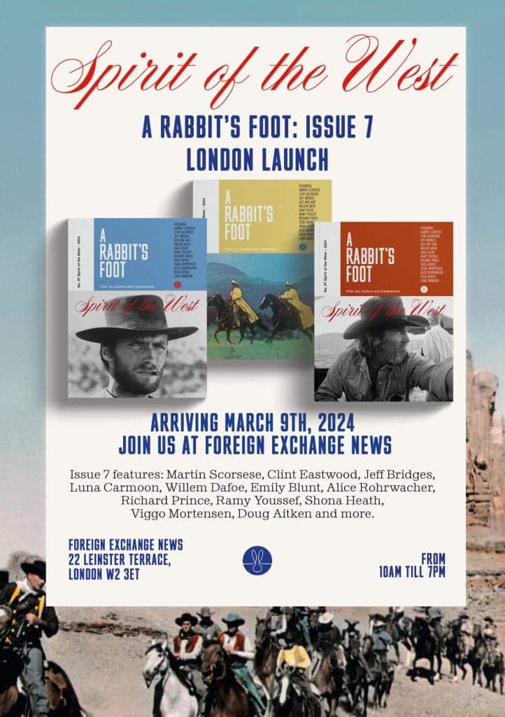 The latest edition of A Rabbit’s Foot explores the ‘Spirit of the West’ in film, art and culture. In the pages of this latest edition you’ll find exclusive interviews with trailblazing filmmakers Martin Scorsese, Gus Van Sant, Clint Eastwood, Emily Blunt, Jeff Bridges, and Todd Haynes, as well as exciting newcomers Luna Carmoon , Ramy Youssef and Alice Rohrwacher. You’ll also find thoughtful essays on Chet Baker, Sidney Poitier, John Ford’s The Searchers and more, accompanied, as always, by timeless imagery.