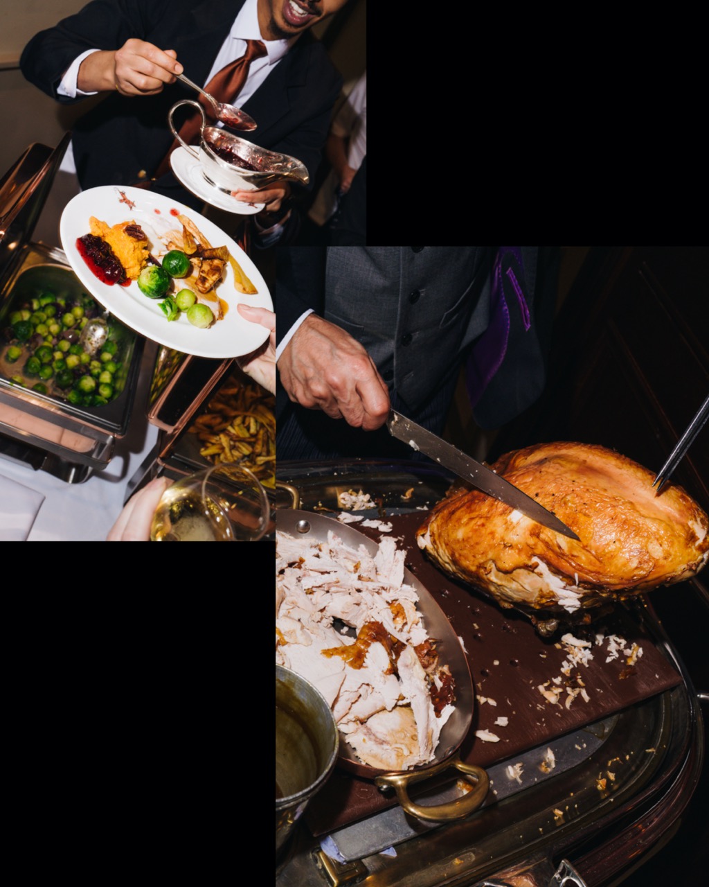 Wilton’s—London’s historic institution dating back to 1742—set the scene perfectly. Known for its classic interiors, “Bull shot” cocktails, and exceptional seafood, the restaurant’s chef served a typical fish starter before a traditional American Thanksgiving dinner: complete with a marshmallow-pecan sweet potato casserole. Dessert was a soft cheesecake, a nod to a running joke in the film (we still can’t confirm whether Clooney actually had a slice, unlike his on-screen counterpart). In his speech, Charles also insisted everyone try Wilton’s legendary “Bull shot” which is a mix of vodka, beef consommé and Wilton’s own spice mix.