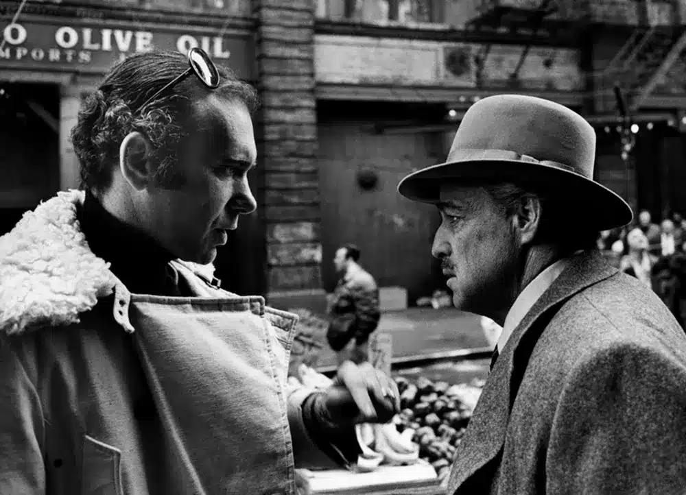 Al Ruddy and Marlon Brando on the set of The Godfather (dir. Francis Ford Coppola).