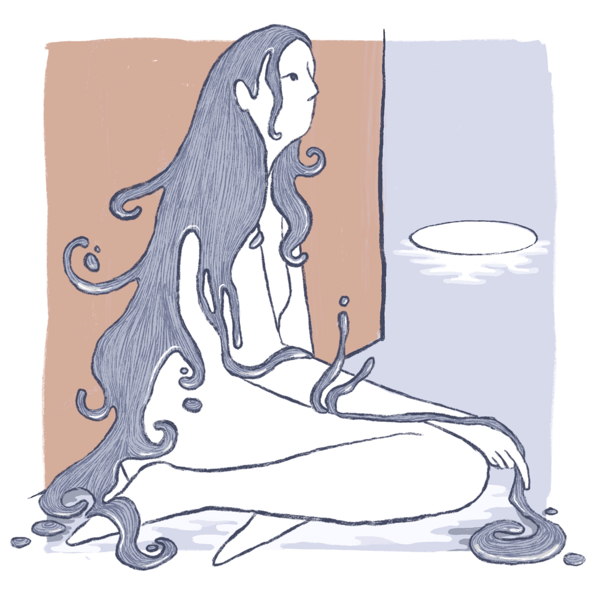 The sun has passed through the fountain’s casement and the shadows have switched sides. The gallery guards are asking tourists to leave, which they do in dazed, obedient droves. But I am a mute, silver lady. Perhaps they will not notice me, perhaps they will not ask me to leave. The sounds of the guards’ heels are different now that the visitors’ clothes and skins are gone, no longer absorbing the clip clop clip clop towards me. Do not ask me to leave, I am a mute, silver lady, let me stay. I will not move, so the baffled guards lift me gently under my arms, but my body is limp and heavy, too difficult to move. They try once and I slump down the gallery wall. Twice and a piece of foil falls from my eyes and catches the blue flash from the guard’s radio. When the guards try a third time, four of them now, two under each arm, a surge of energy rushes through the room and the guards fall backwards. My arms dissolve. They are falling loose into shimmering drops, like my shoulders, my eyes from their sockets, my silvering hair. I turn into mercury and scatter all over the floor.