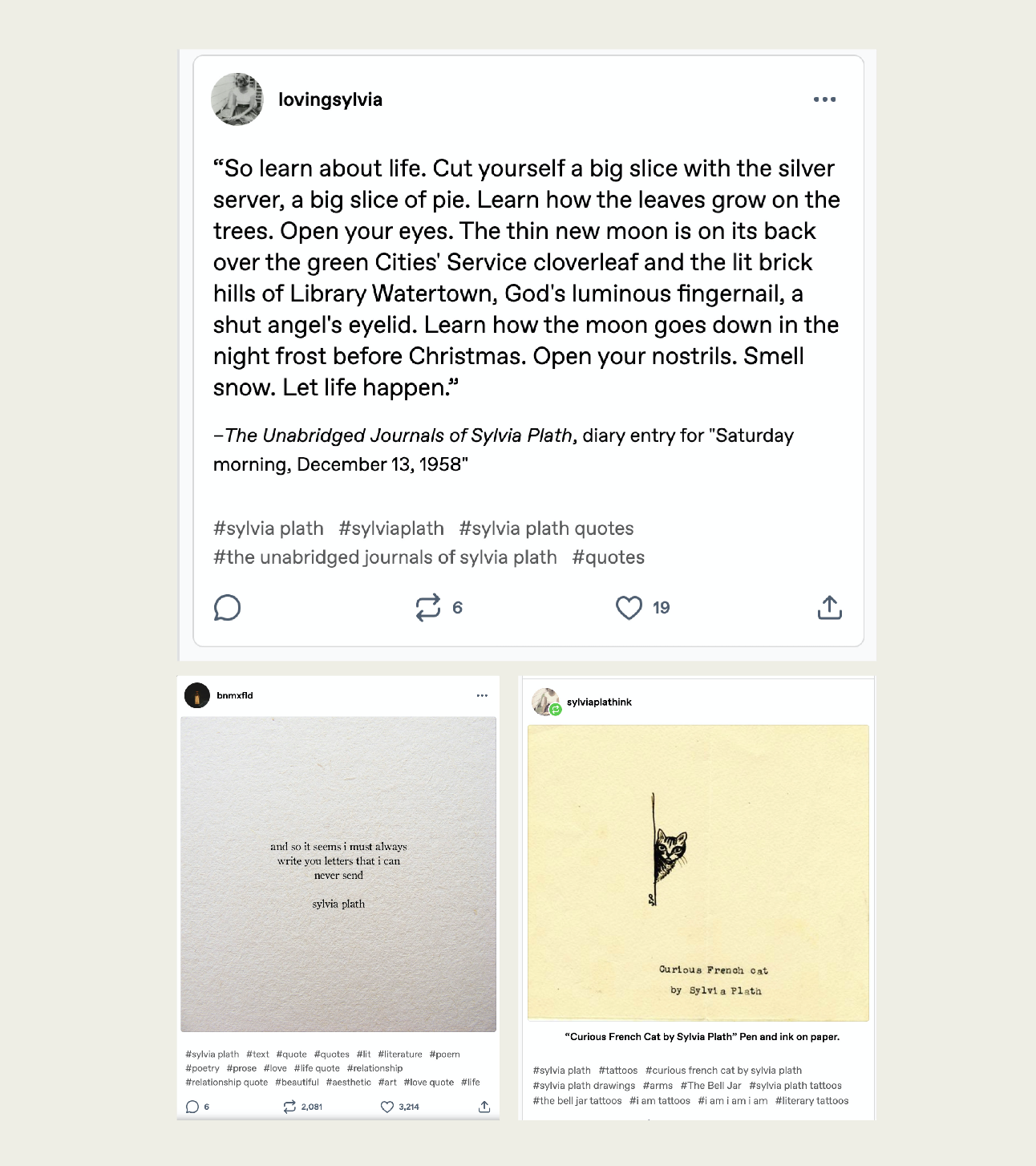 But what I notice the most is how quiet these Plaths are. The current wave of coquette memes do sometimes cite Plath’s words, but usually as hollow snippets from her letters and diaries. A few phrases are perennial favourites: “I desire the things that will destroy me in the end” ,“I talk to God but the sky is empty”, “kiss me and you will see how important I am”. Of course we like these quotes. They are vague and compelling as a psychic trying to map facts on to a stranger. Mysterious as an Angelina Jolie back tattoo.